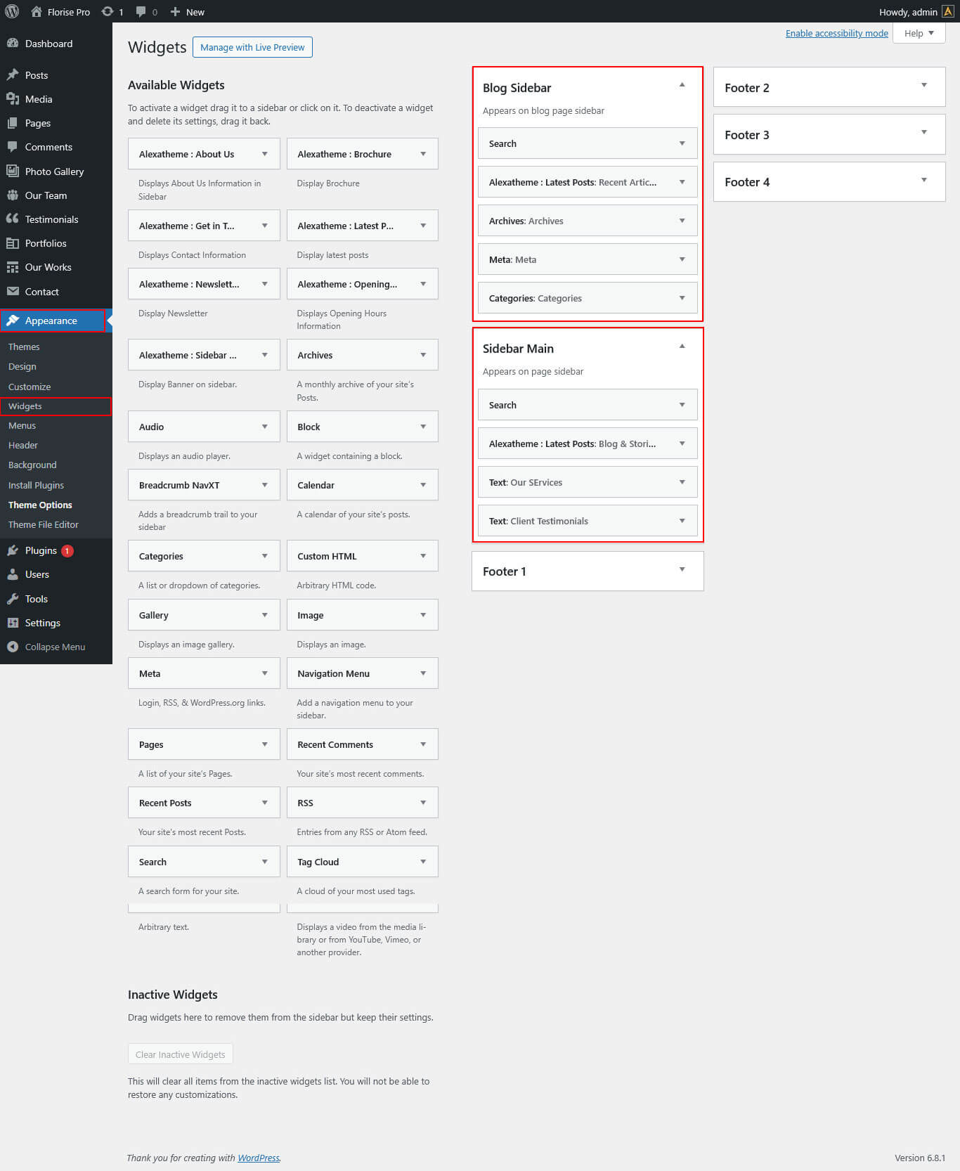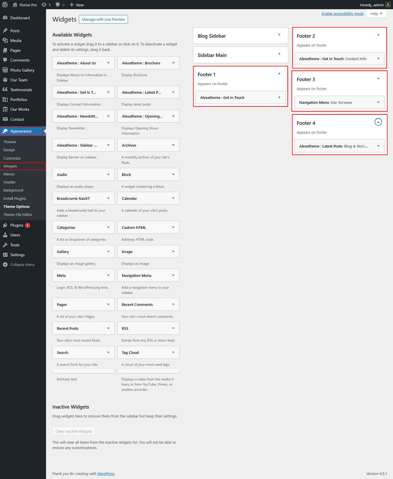 - For footer column 1: Go to Appearance >> Widgets >> Footer 1.