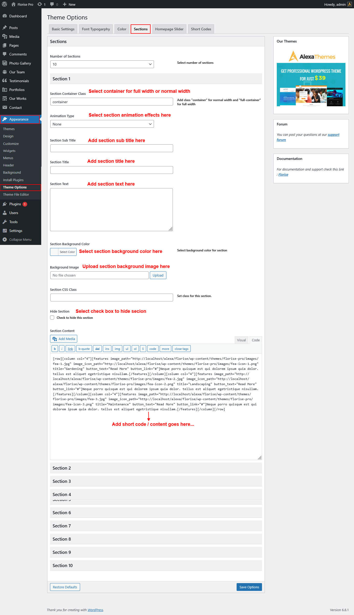 For setting up Welcome To Florise section Go to >> Appearance >> Theme Options >> Sections >> Select Section 2.