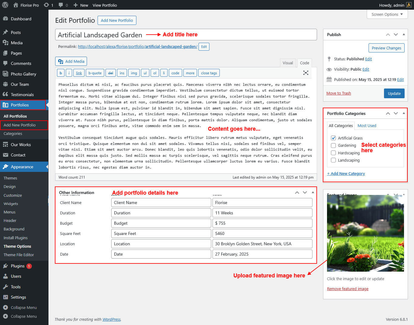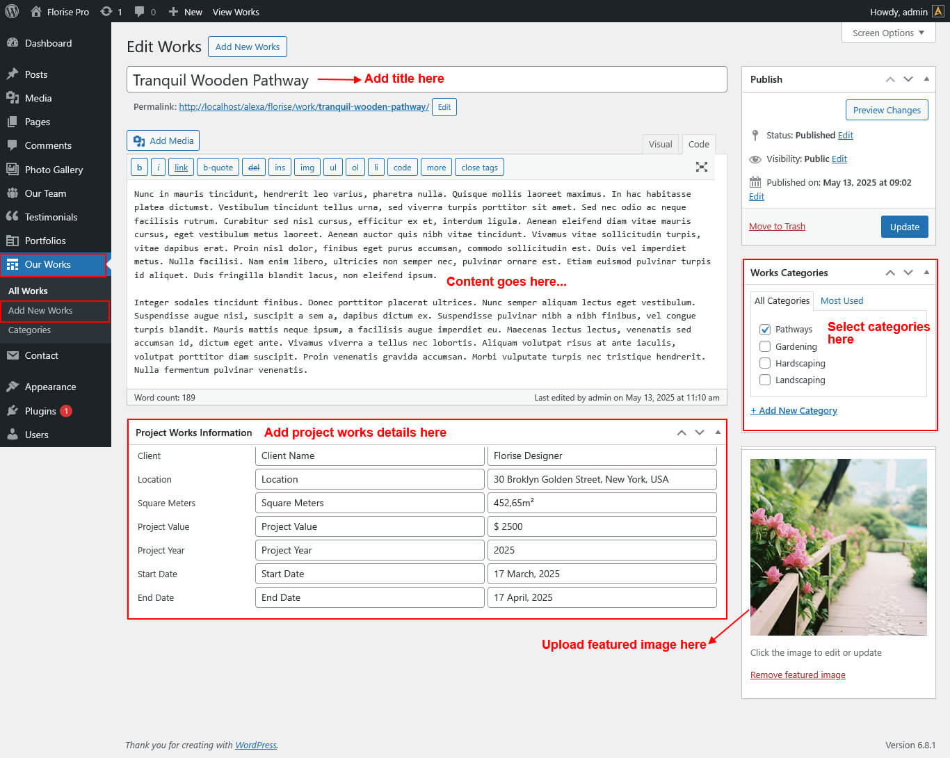 For setting Our Latest Work section first of all you need to add some works by using Our Works post type please see the below screenshot.
