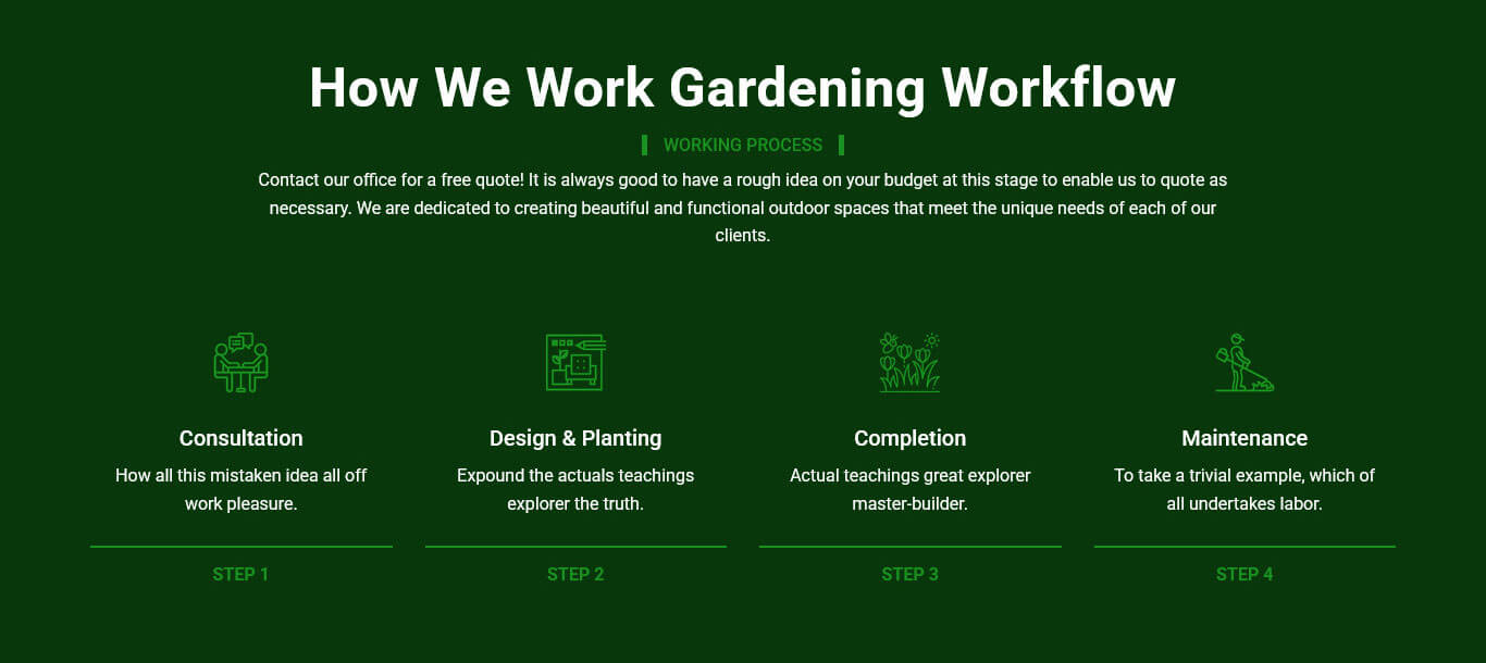 [row][column col="3"][process image_icon_path="http://localhost/alexa/florise/wp-content/themes/florise-pro/images/prc-1.png" title="Consultation" step="Step 1" title_color="#ffffff" text_color="#ffffff"]How all this mistaken idea all off work pleasure.[/process][/column][column col="3"][process image_icon_path="http://localhost/alexa/florise/wp-content/themes/florise-pro/images/prc-2.png" title="Design & Planting" step="Step 2" title_color="#ffffff" text_color="#ffffff"]Expound the actual teachings explorer the truth.[/process][/column][column col="3"][process image_icon_path="http://localhost/alexa/florise/wp-content/themes/florise-pro/images/prc-3.png" title="Completion" step="Step 3" title_color="#ffffff" text_color="#ffffff"]Actual teachings great explorer master-builder.[/process][/column][column col="3"][process image_icon_path="http://localhost/alexa/florise/wp-content/themes/florise-pro/images/prc-4.png" title="Maintenance" step="Step 4" title_color="#ffffff" text_color="#ffffff"]To take a trivial example, which of all undertakes labor.[/process][/column][/row]