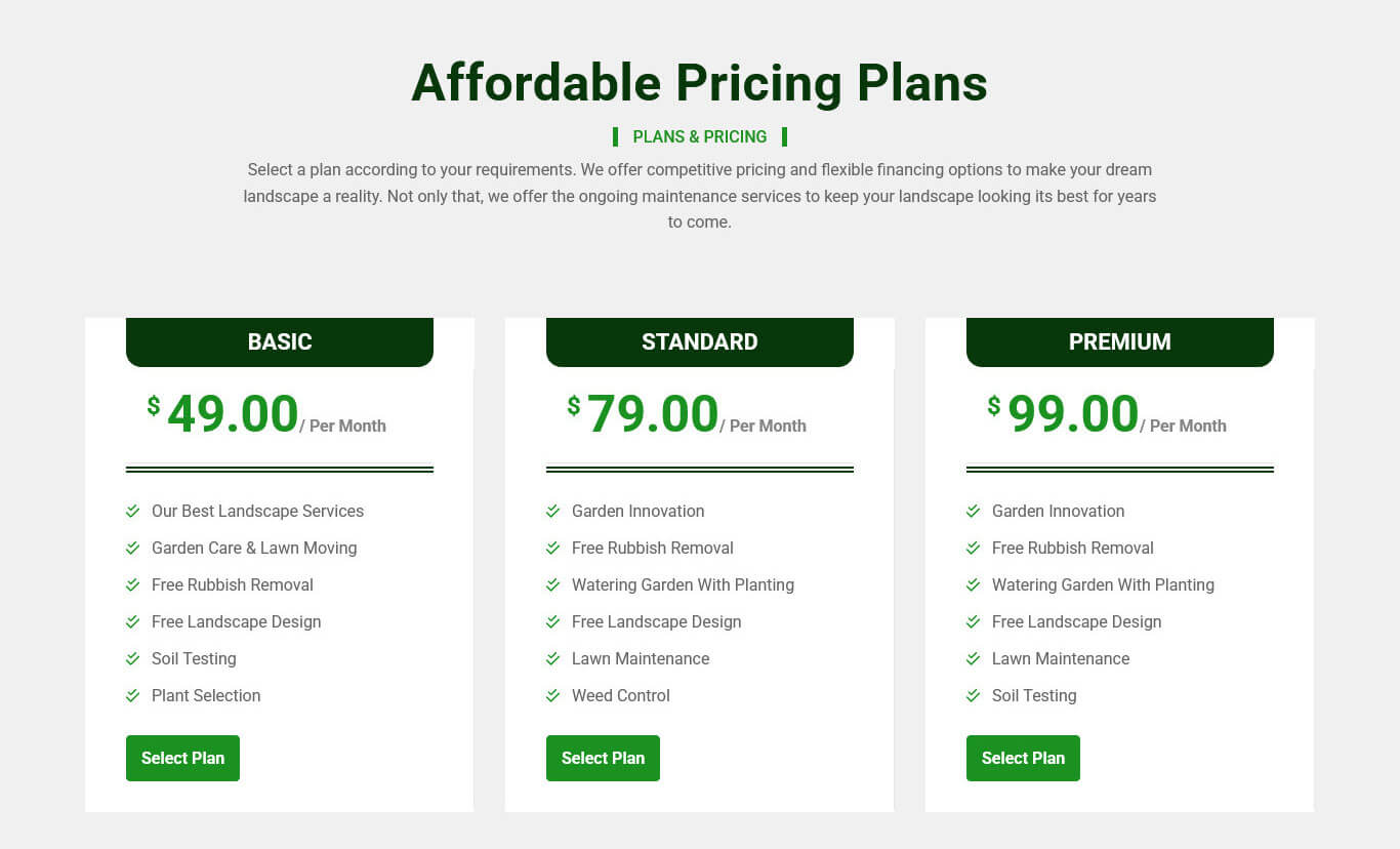 [row][column col="4"][pricing-plan top_title="Most Popular Choice" title="Basic" price_sign="$" price="49.00" month="Per Month" row1="Our Best Landscape Services" row2="Garden Care & Lawn Moving" row3="Free Rubbish Removal" row4="Free Landscape Design" row5="Soil Testing" row6="Plant Selection" btn_label="Select Plan" btn_link="#"][/column][column col="4"][pricing-plan top_title="10% Offer Standard Plan" title="Standard" price_sign="$" price="79.00" month="Per Month" row1="Garden Innovation" row2="Free Rubbish Removal" row3="Watering Garden With Planting" row4="Free Landscape Design" row5="Lawn Maintenance" row6="Weed Control" btn_label="Select Plan" btn_link="#"][/column][column col="4"][pricing-plan top_title="20% Offer Premium Plan" title="Premium" price_sign="$" price="99.00" month="Per Month" row1="Garden Innovation" row2="Free Rubbish Removal" row3="Watering Garden With Planting" row4="Free Landscape Design" row5="Lawn Maintenance" row6="Soil Testing" btn_label="Select Plan" btn_link="#"][/column][/row]