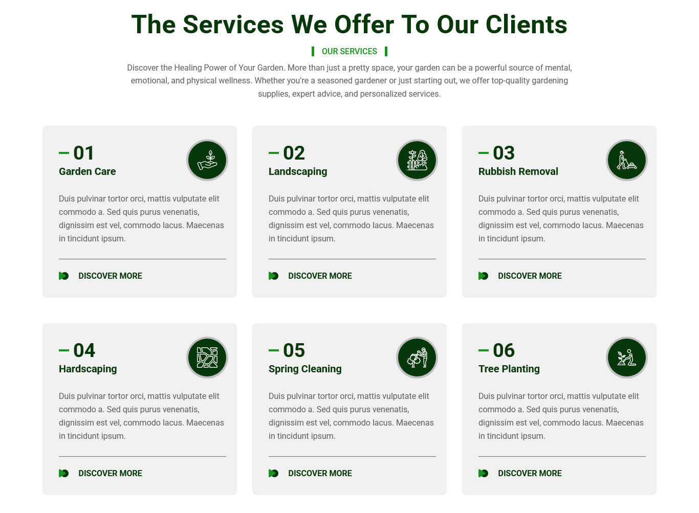 [row][column col="4"][services ser_number="01" image_icon_path="http://localhost/alexa/florise/wp-content/themes/florise-pro/images/ser-1.png" title="Garden Care" button_text="Discover More" button_link="#"]Duis pulvinar tortor orci, mattis vulputate elit commodo a. Sed quis purus venenatis, dignissim est vel, commodo lacus. Maecenas in tincidunt ipsum.[/services][/column][column col="4"][services ser_number="02" image_icon_path="http://localhost/alexa/florise/wp-content/themes/florise-pro/images/ser-2.png" title="Landscaping" button_text="Discover More" button_link="#"]Duis pulvinar tortor orci, mattis vulputate elit commodo a. Sed quis purus venenatis, dignissim est vel, commodo lacus. Maecenas in tincidunt ipsum.[/services][/column][column col="4"][services ser_number="03" image_icon_path="http://localhost/alexa/florise/wp-content/themes/florise-pro/images/ser-3.png" title="Rubbish Removal" button_text="Discover More" button_link="#"]Duis pulvinar tortor orci, mattis vulputate elit commodo a. Sed quis purus venenatis, dignissim est vel, commodo lacus. Maecenas in tincidunt ipsum.[/services][/column][column col="4"][services ser_number="04" image_icon_path="http://localhost/alexa/florise/wp-content/themes/florise-pro/images/ser-4.png" title="Hardscaping" button_text="Discover More" button_link="#"]Duis pulvinar tortor orci, mattis vulputate elit commodo a. Sed quis purus venenatis, dignissim est vel, commodo lacus. Maecenas in tincidunt ipsum.[/services][/column][column col="4"][services ser_number="05" image_icon_path="http://localhost/alexa/florise/wp-content/themes/florise-pro/images/ser-5.png" title="Spring Cleaning" button_text="Discover More" button_link="#"]Duis pulvinar tortor orci, mattis vulputate elit commodo a. Sed quis purus venenatis, dignissim est vel, commodo lacus. Maecenas in tincidunt ipsum.[/services][/column][column col="4"][services ser_number="06" image_icon_path="http://localhost/alexa/florise/wp-content/themes/florise-pro/images/ser-6.png" title="Tree Planting" button_text="Discover More" button_link="#"]Duis pulvinar tortor orci, mattis vulputate elit commodo a. Sed quis purus venenatis, dignissim est vel, commodo lacus. Maecenas in tincidunt ipsum.[/services][/column][/row]