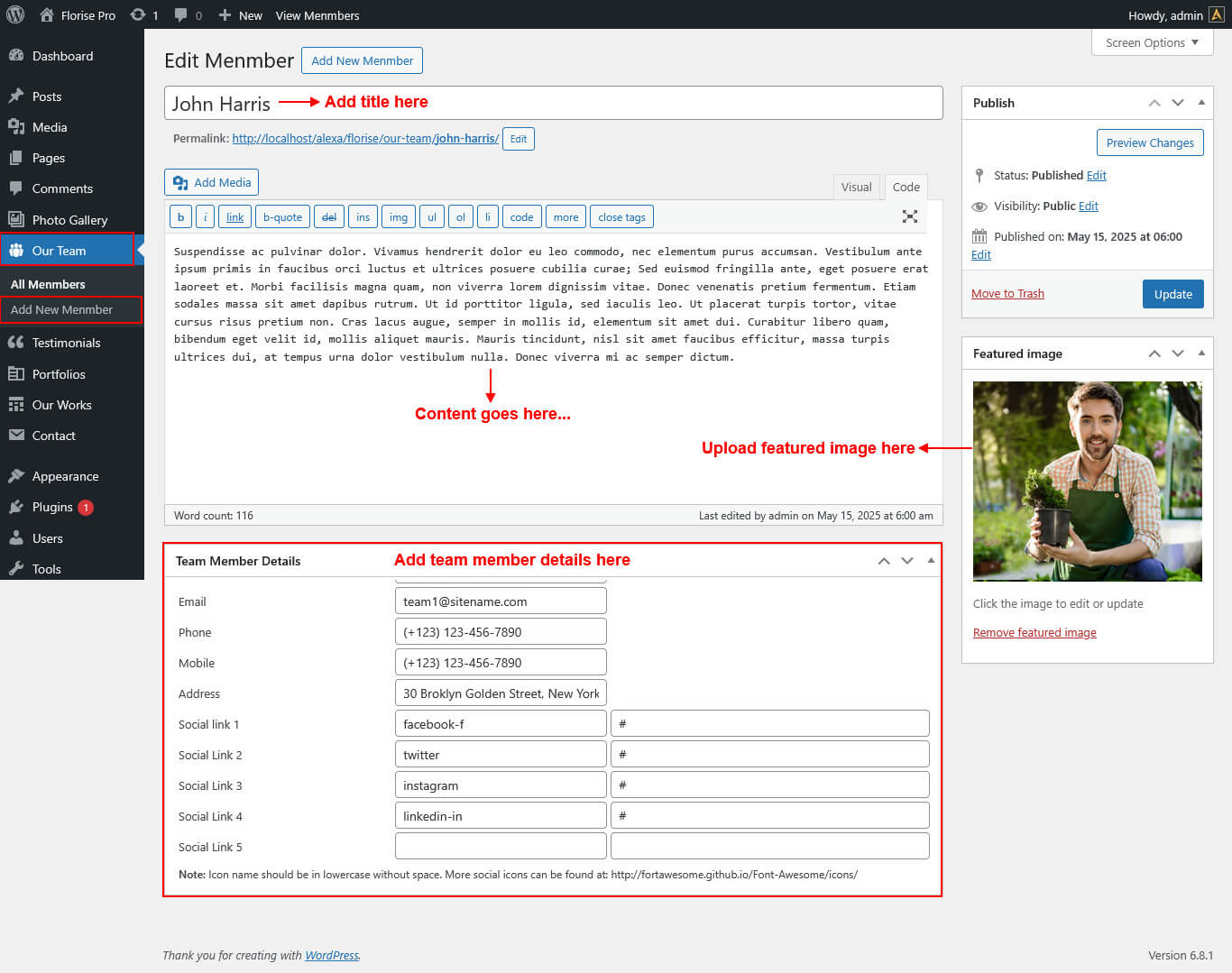 For setting up Expert Team Member section first of all you need to add some team by using our team post type please see the below screenshot.