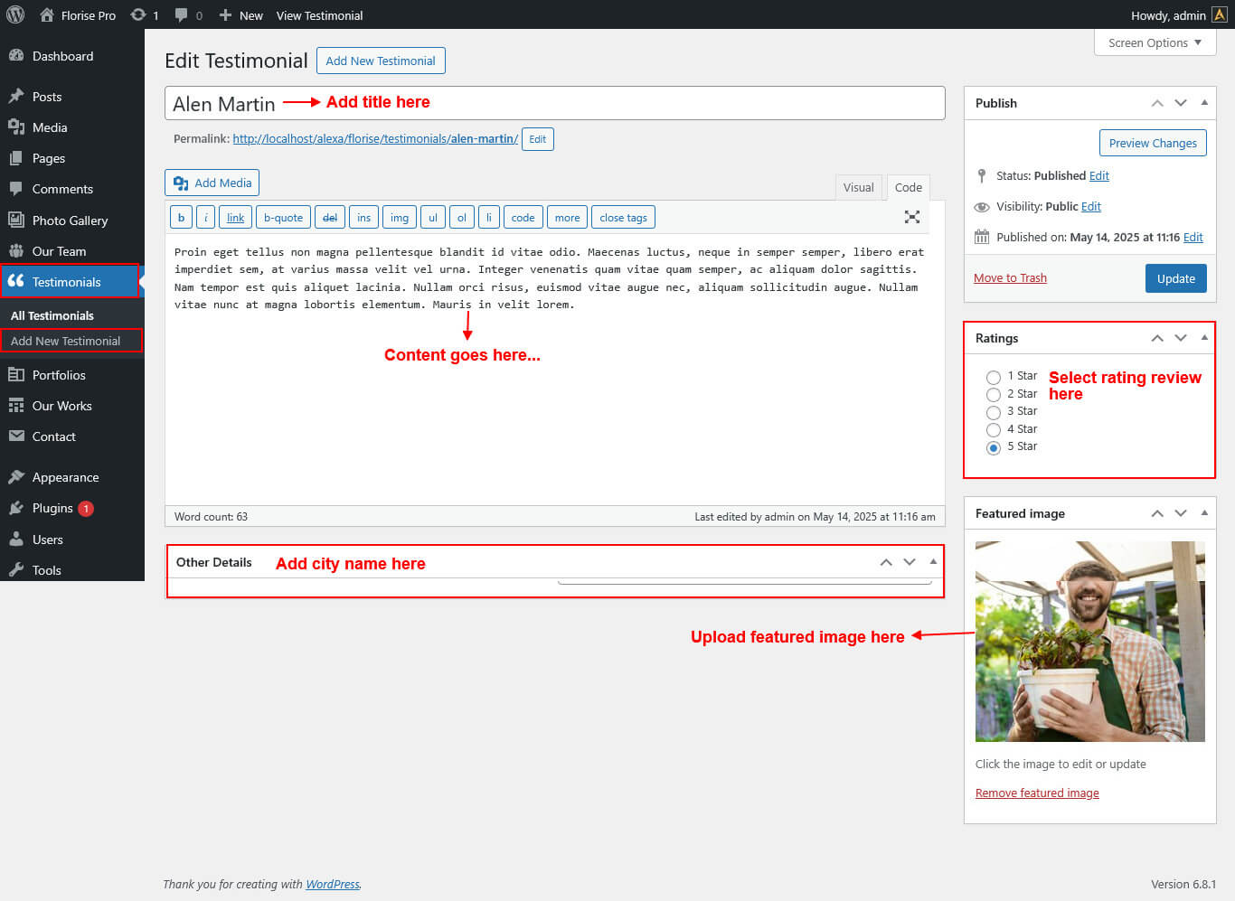 For setting up Clients Testimonials section first of all you need to add some testimonials by using testimonials post type please see the below screenshot.