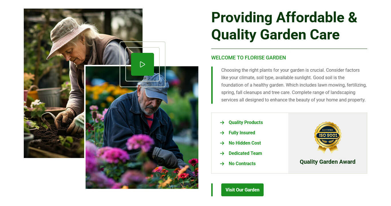 [row][column col="6"][about_left image_path_1="http://localhost/alexa/florise/wp-content/themes/florise-pro/images/abt-img-1.jpg" image_path_2="http://localhost/alexa/florise/wp-content/themes/florise-pro/images/abt-img-2.jpg" video_link="https://www.youtube.com/embed/KIFbPINEW8A"][/column][column col="6"][about_right image_path="http://localhost/alexa/florise/wp-content/themes/florise-pro/images/award-img.png" sub_title="Welcome To Florise Garden" title="Providing affordable & quality garden care" award_title="Quality Garden Award" list_text_1="Quality Products" list_text_2="Fully Insured" list_text_3="No Hidden Cost" list_text_4="Dedicated Team" list_text_5="No contracts" button_text="Visit Our Garden" button_link="#"]Choosing the right plants for your garden is crucial. Consider factors like your climate, soil type, available sunlight. Good soil is the foundation of a healthy garden. Which includes lawn mowing, fertilizing, spring, fall cleanups and tree care. Complete range of landscaping services all designed to enhance the beauty of your home and property.[/about_right][/column][/row]