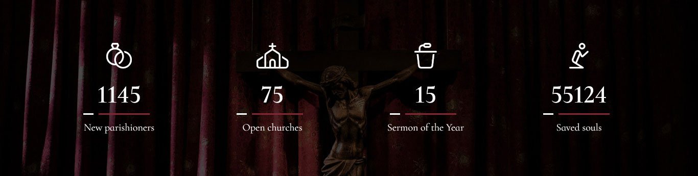 [counter_wrap][counter icon="rings-wedding" icon_style="light" title="New parishioners" count="1145" num_color="#ffffff" title_color="#ffffff" icon_color="#ffffff"][counter icon="church" icon_style="light" title="Open churches" count="75" num_color="#ffffff" title_color="#ffffff" icon_color="#ffffff"][counter icon="podium" icon_style="light" title="Sermon of the Year" count="15" num_color="#ffffff" title_color="#ffffff" icon_color="#ffffff"][counter icon="person-praying" icon_style="light" title="Saved souls" count="55124" num_color="#ffffff" title_color="#ffffff" icon_color="#ffffff"][/counter_wrap]