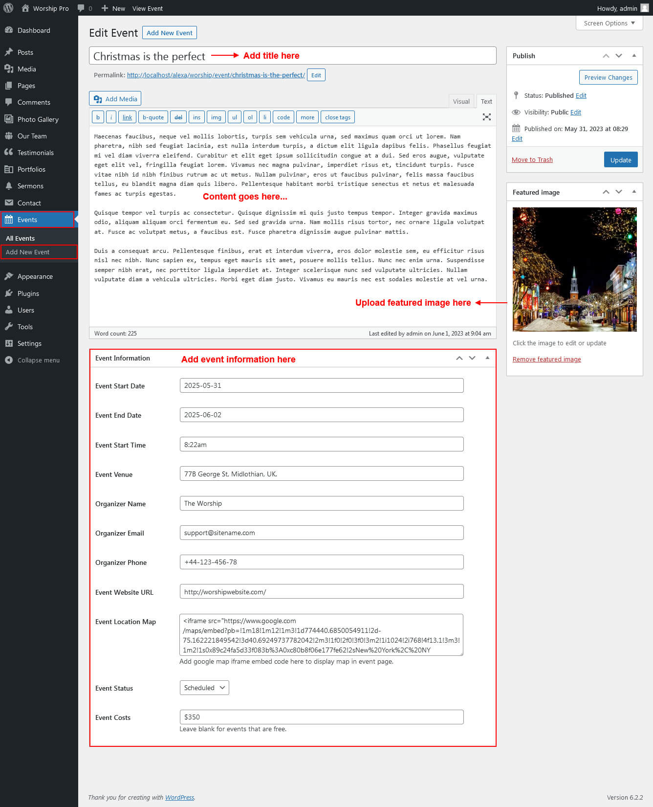For setting up Upcoming Events section first of all you need to add some event by using Event post type please see the below screenshot.