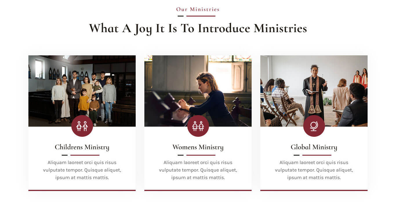 [row][column col="4"][ministries image_path="http://localhost/alexa/worship/wp-content/themes/worship-pro/images/min-1.jpg" icon="children" icon_style="light" title="Childrens Ministry" link="#"]Aliquam laoreet orci quis risus vulputate tempor. Quisque aliquet, ipsum at mattis mattis.[/ministries][/column][column col="4"][ministries image_path="http://localhost/alexa/worship/wp-content/themes/worship-pro/images/min-2.jpg" icon="people-dress" icon_style="light" title="Womens Ministry" link="#"]Aliquam laoreet orci quis risus vulputate tempor. Quisque aliquet, ipsum at mattis mattis.[/ministries][/column][column col="4"][ministries image_path="http://localhost/alexa/worship/wp-content/themes/worship-pro/images/min-3.jpg" icon="globe-stand" icon_style="light" title="Global Ministry" link="#"]Aliquam laoreet orci quis risus vulputate tempor. Quisque aliquet, ipsum at mattis mattis.[/ministries][/column][/row]