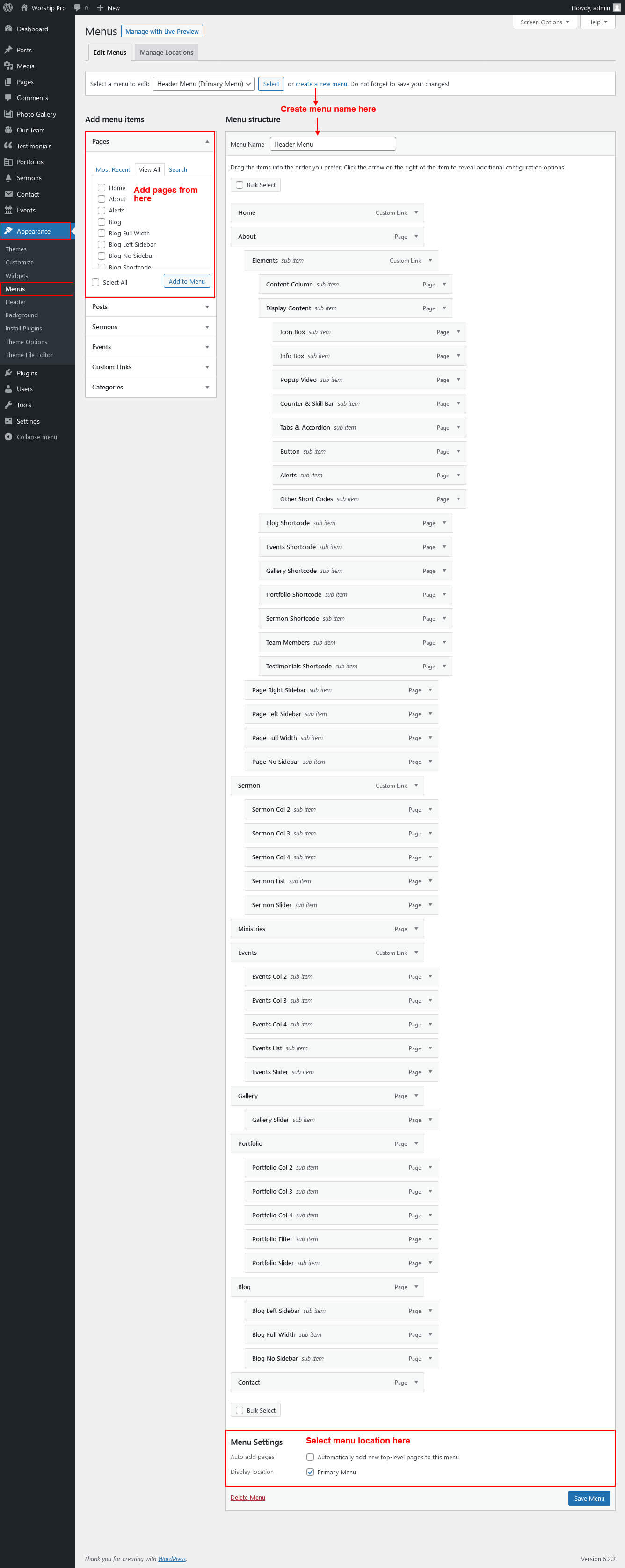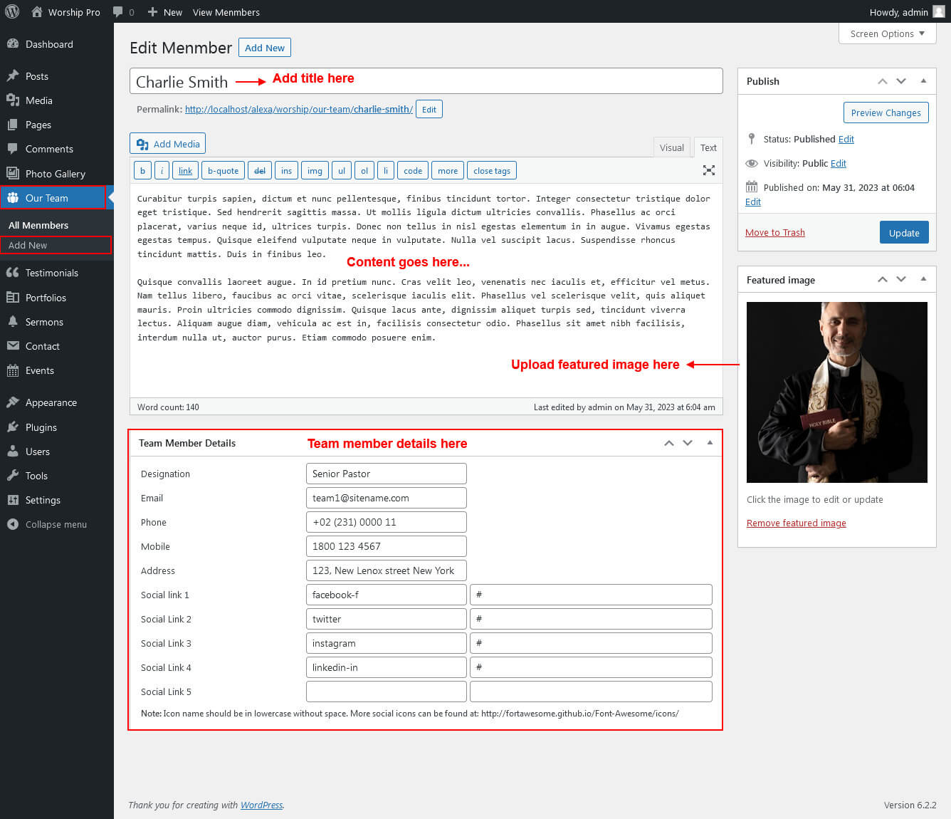 For setting up Our Pastors section first of all you need to add some team by using our team post type please see the below screenshot.