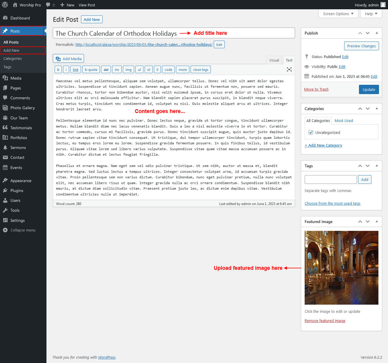 - Type in your post content. For more information on adding posts, please check the following link http://codex.wordpress.org/Posts_Add_New_SubPanel.