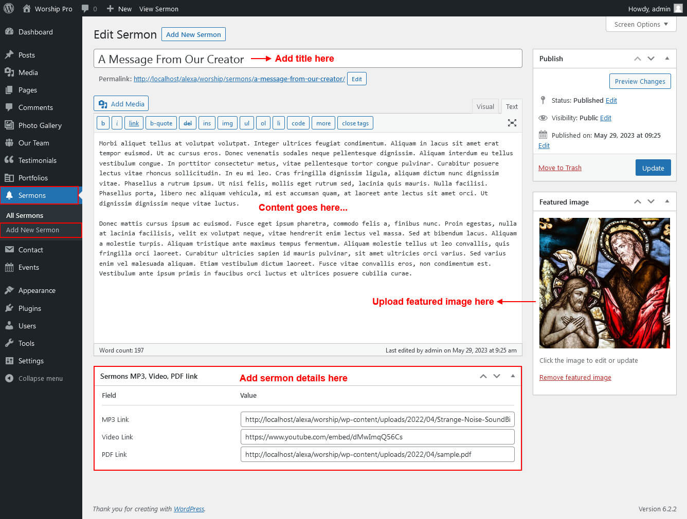 For setting up Sermon Agenda section first of all you need to add some sermon by using Sermon post type please see the below screenshot.