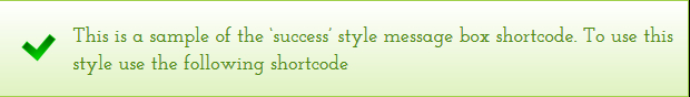 [message type="success"]This is a sample of the 'success' style message box shortcode. To use this style use the following shortcode[/message]