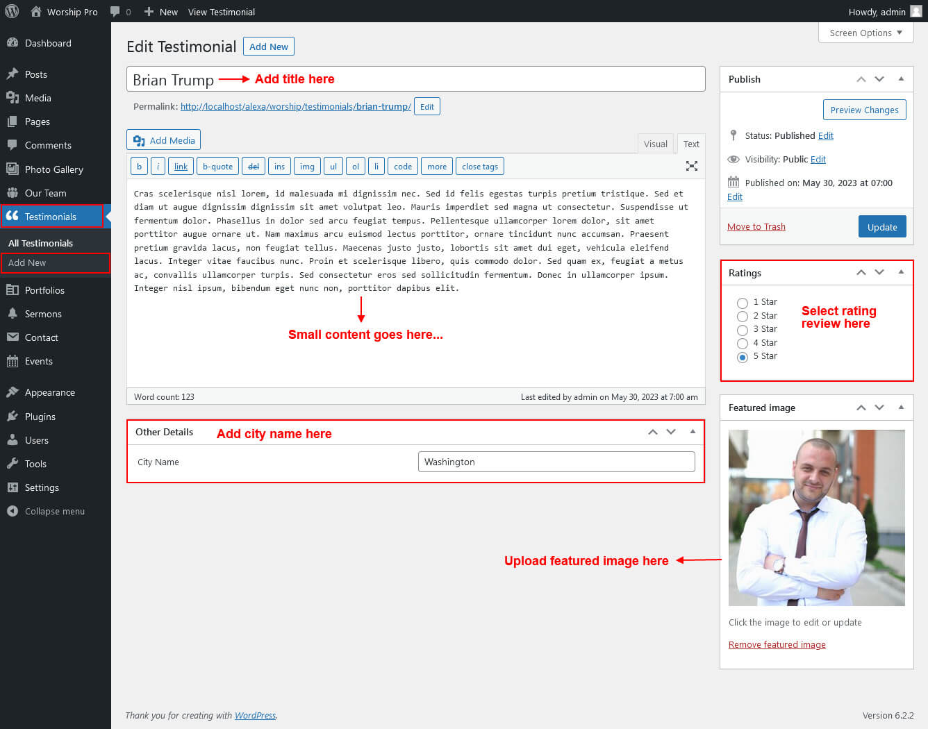 For setting up Our Testimonials section first of all you need to add some testimonials by using testimonials post type please see the below screenshot.